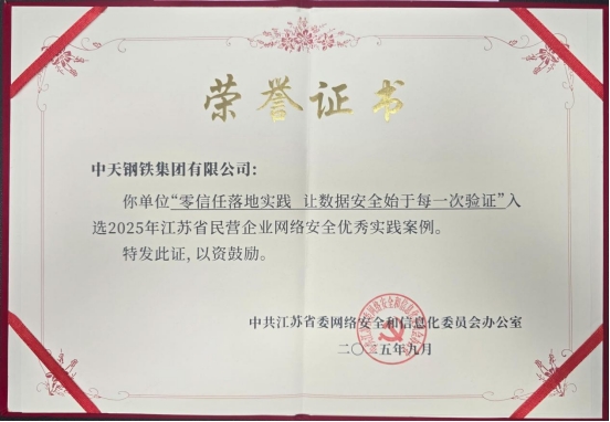 日前,由省委网信办主办的2025年江苏省民营企业网络安全优秀实践案例征集活动正式公布评选结果,全省共有10家企业案例入选。中天钢铁集团凭借《零信任落地实践:让数据安全始于每一次验证》案例成功入围,彰显了集团在推动制造业数字化转型过程中对数据安全的高度重视与责任担当。