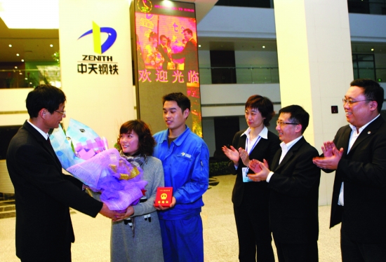 本报讯 记者昨日从中天钢铁获悉,本报10月9日报道的“中天钢铁杯”常州市第十届相亲节活动已喜结第一对果实,中天钢铁的工会、宣传部、团委干部昨日为这对新人送上了鲜花和祝福。