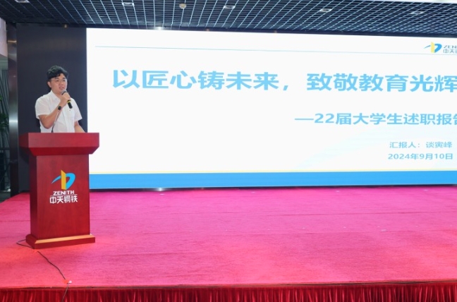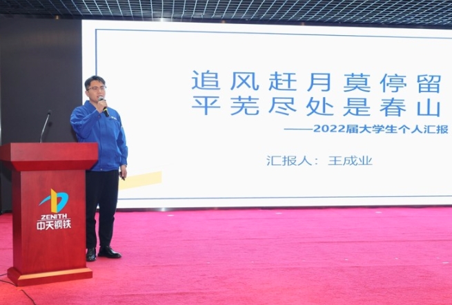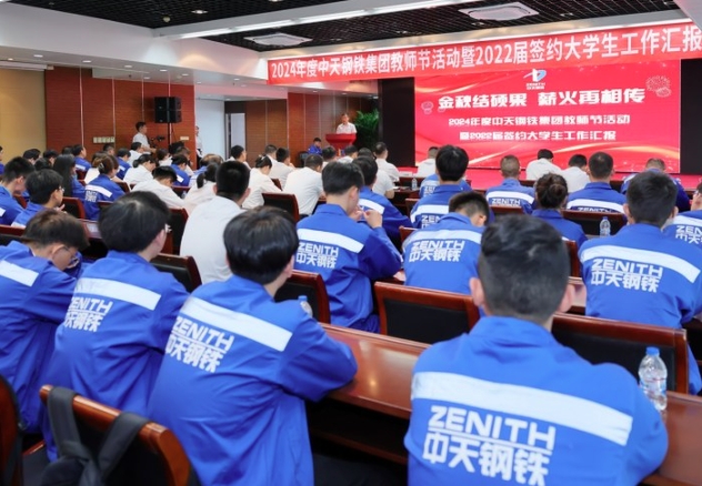 在当天的活动中,5名2022届签约大学生汇报了入职以来的工作成果。集团办吴一帆讲述了“办文、办会、办事”的文秘之道,通过导师带教和实战练习,他积攒了更多的底气、经验和从容;特钢三轧厂王成业分享了技能提升、班组建设、创新创效等方面成果,他两次带队参加六西格玛项目评比,均斩获全国“示范级”称号;南通炼钢厂王荣健毕业于东北大学冶金工程专业,他坚持在一线历练,从连铸中包工做起,逐步成长为连铸见习工长;淮安人力资源处谭寅峰是淮安公司首批签约大学生,主要参与招聘条线工作,为公司建设发展持续输送人才;皓鸣科技张泳翔入职以来参与了一卡通系统、酒店运维管理平台等信息项目的开发、测试、运维等工作,他的长期目标是向项目管理方向发展。